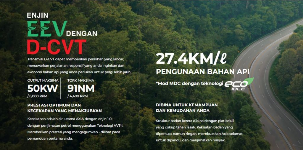 PRESTASI OPTIMUM DAN KECEKAPAN YANG MENAKJUBKAN – Kecekapan adalah ciri utama AXIA dengan enjin 1.0L dengan penjimatan petrol menggunakan Teknologi VVT-I. Memberikan prestasi yang mengagumkan – dilihat pada pemanduan pertama anda.